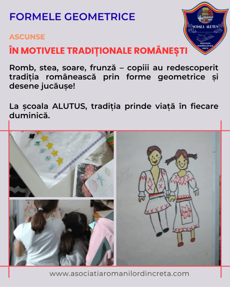 Elevii Școlii de Weekend ALUTUS au explorat bogăția motivelor tradiționale românești printr-o lentilă inedită: formele geometrice. Steaua, rombul, spirala, soarele și frunza s-au transformat în elemente-cheie ale unei lecții interactive despre simboluri, semnificații și identitate culturală.